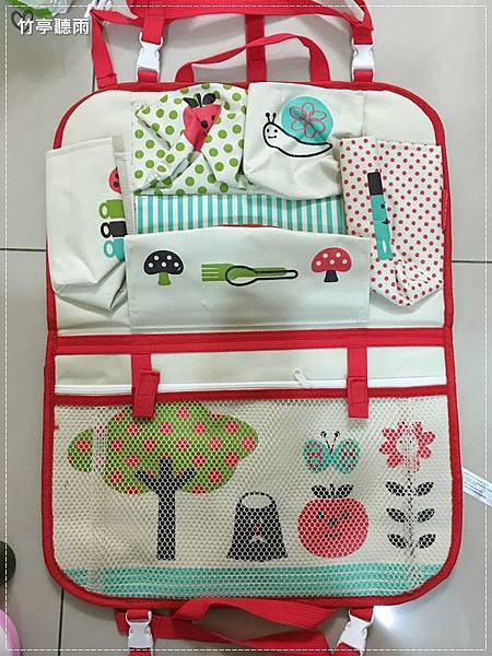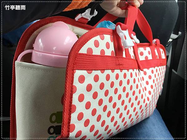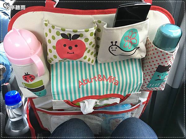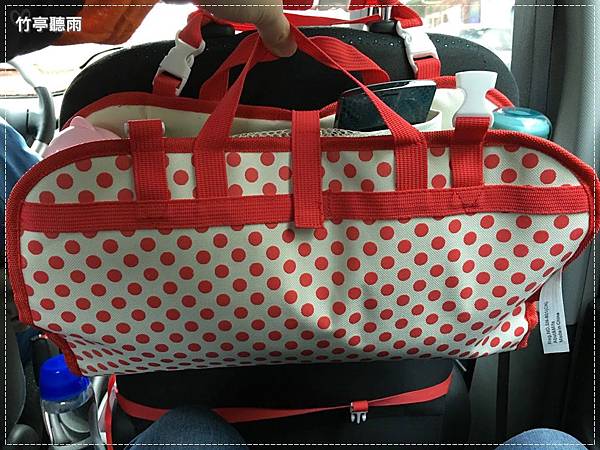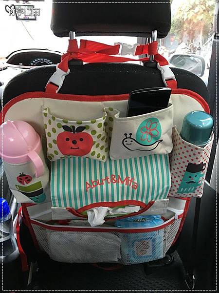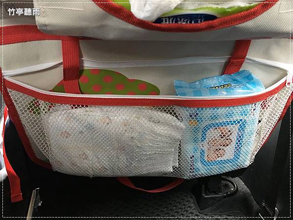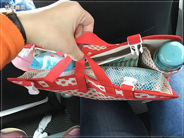 因為太卡腳,後來裝在汽座前面(駕駛座後背),覺得拿米餅跟小包濕紙巾還算方便。