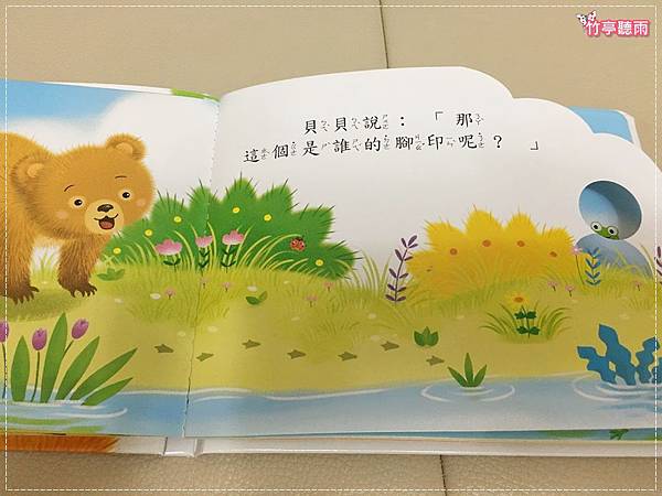 地上這個尖尖的又是誰的腳印呢? (右邊的圓洞可以看到小青蛙,小小咪很愛翻來翻去的。)