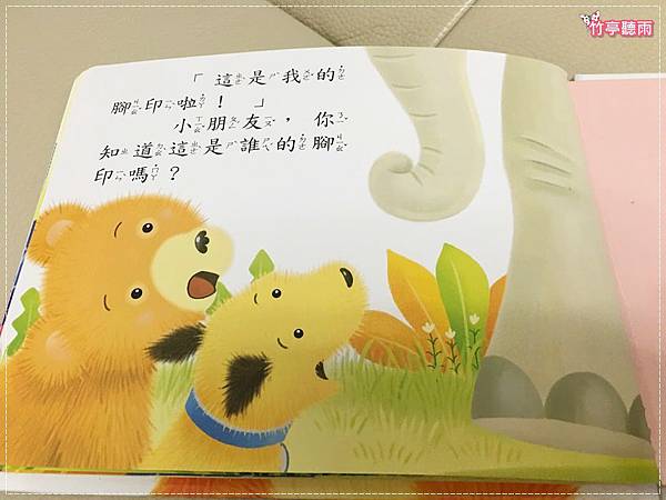 這本書的主角是狗狗,他發現地上有圓圓的腳印,便循線找到腳印的主人-小熊貝貝。