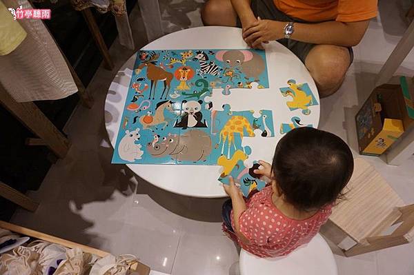 爸爸在旁邊幫忙。雖然小小咪已經會自己拼20片有底板的拼圖,