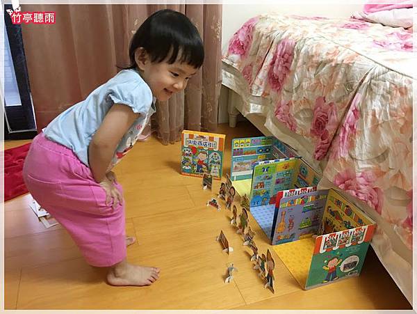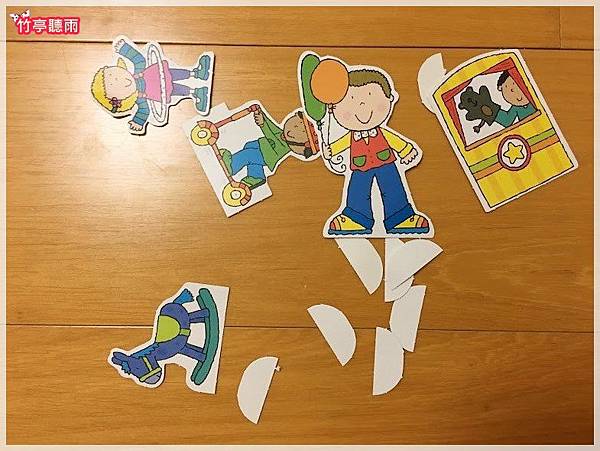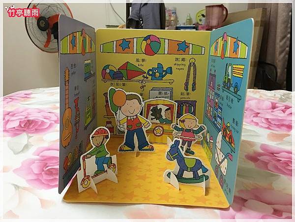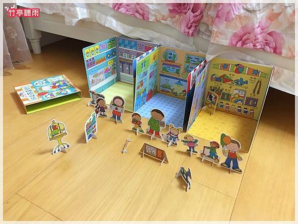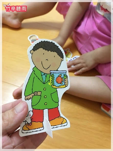 ▼ 每本書都有自己的玩偶跟場景裝飾立牌,要搭配半圓形的底座半圓紙片來讓他們站立。(不過玩具店這本的紙牌不知為何都沒有裁切到站立的線,要自己剪)
