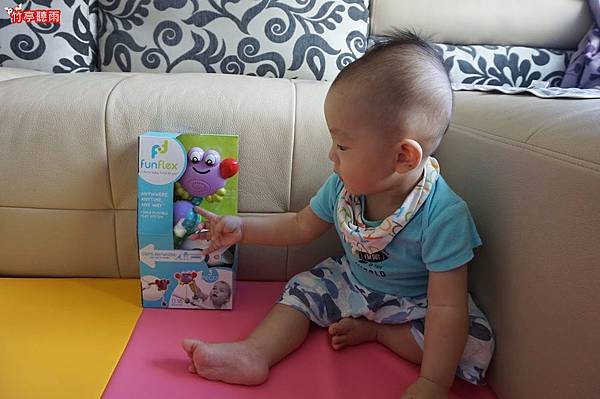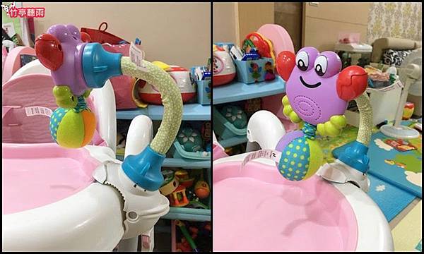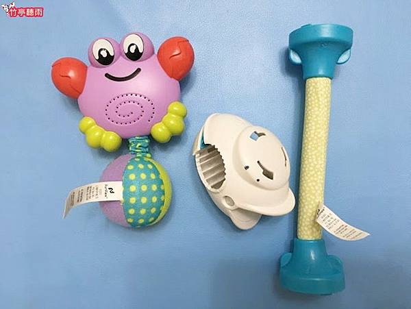 由於球球還沒有玩過有震動功能的搖鈴玩具,小咪媽咪就幫他挑了色彩繽紛可愛的跳舞螃蟹款。