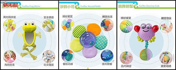 青蛙可以讓寶寶照鏡子觀察自己的模樣,小花則是有寶寶最愛的響紙花瓣與顆粒搖動聲;