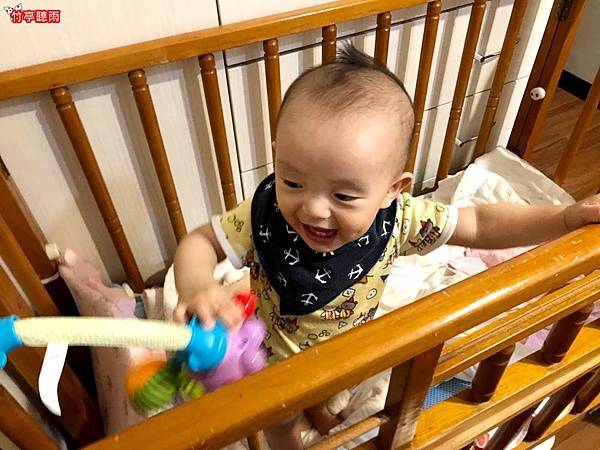 夾在球球的嬰兒床旁邊,他對這隻五彩繽紛的螃蟹感到很好奇。