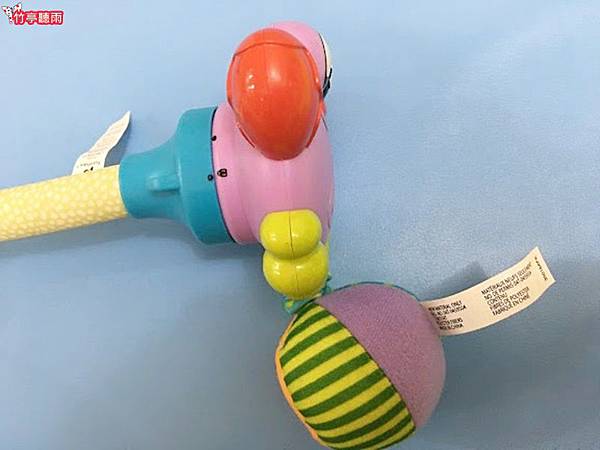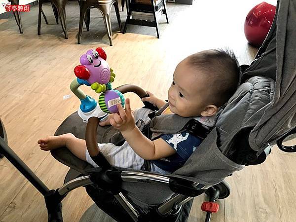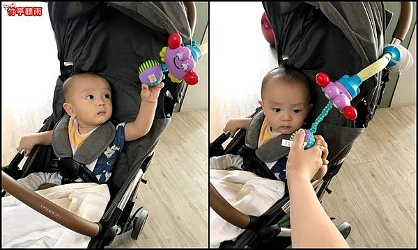 也可以夾在推車上帶著走~球寶對球球上面的標籤很感興趣,會一直伸手摸。