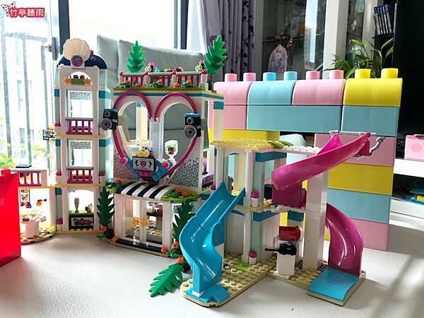 從奶奶家玩回來後,因為有去玩水,小小咪就應景地蓋了一座游泳池,還有兩個人在泳池內滑水呢!