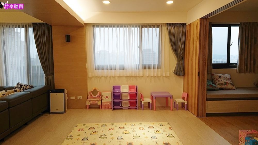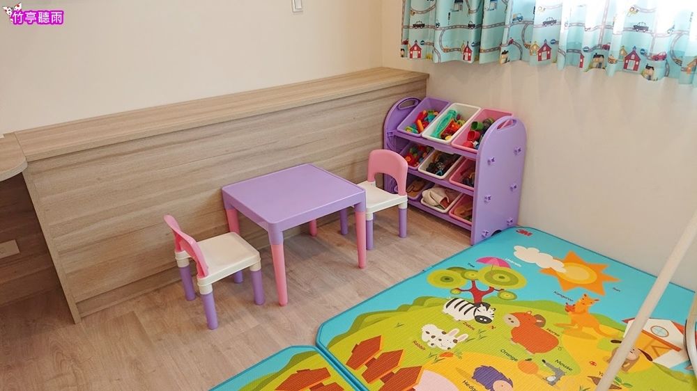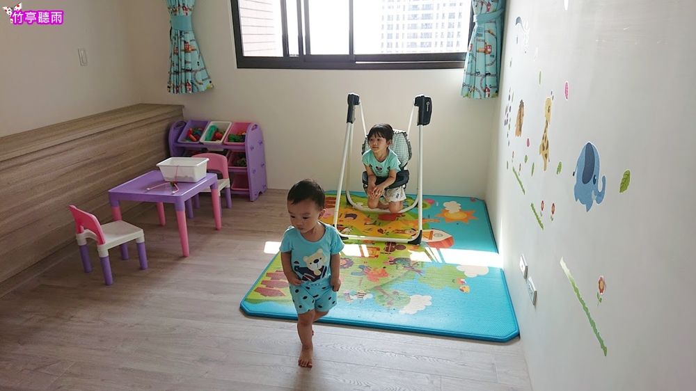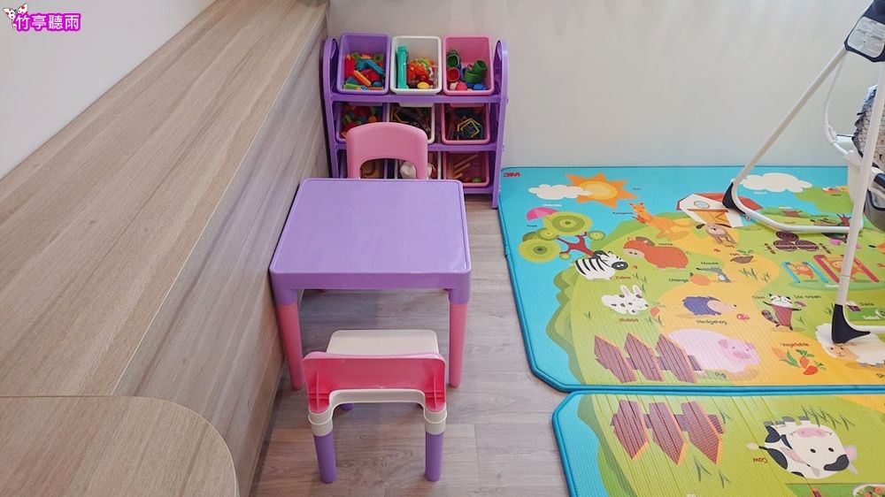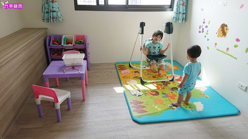 擺上地墊、盪鞦韆、兒童玩具收納架+桌椅,馬上就很有氣氛了!