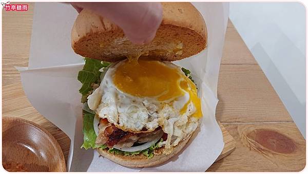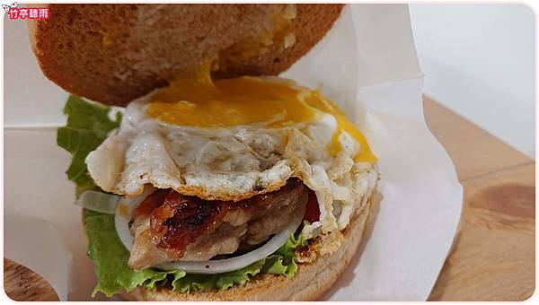 照燒雞腿太陽蛋堡有雞腿.半熟蛋.生菜.番茄.洋蔥,打開可以看到還在流汁的半熟太陽蛋!