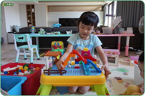 小小咪跟球寶都很喜歡拼積木,但是平常都趴在地上玩,導致陪玩的大人也腰酸背痛。
