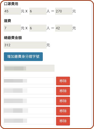 按增加繳費身分證字號,就會自動帶入+1家人的口罩費用與運費。