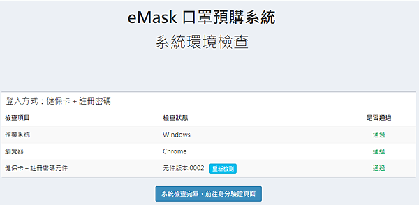 3. 會自動檢測元件,剛剛就已經安裝過了,這邊應該會顯示元件版本,按下【系統檢查完畢,前往身分驗證頁面】