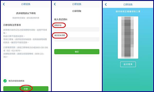 1. 用機台的話先選口罩領取,按同意條款,輸入取貨序號與身分證末四碼,然後就會列印出一張小白單。幫幾個人領就要印幾張小白單。