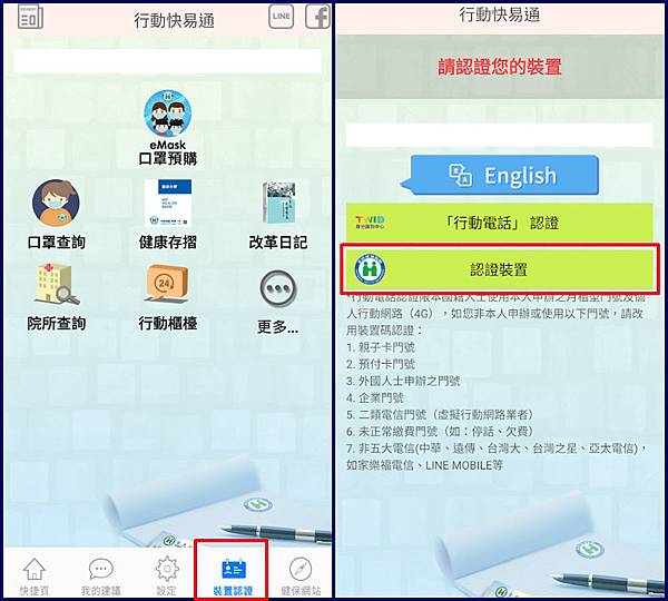 6. 打開全民健保行動快易通APP後,點選右下角的裝置認證,接著選擇有健保圖案的【認證裝置】