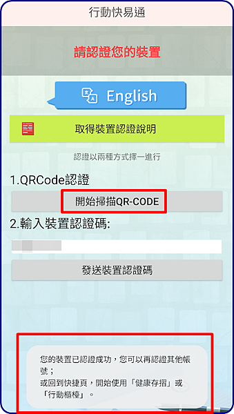 7. 按【開始掃描QR-CODE】,或是手動輸入網頁上的裝置認證碼也可以。
