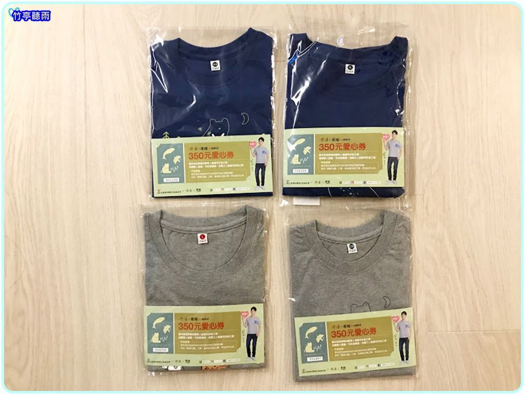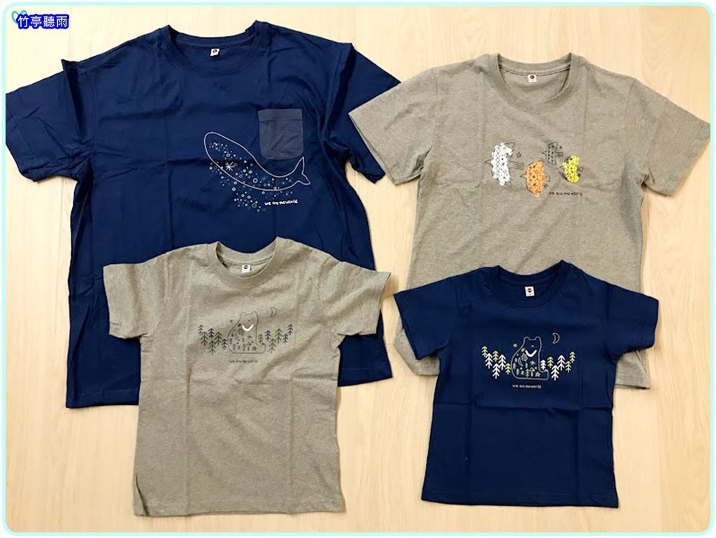 尺寸分成男生款(鯨魚圖案): M/L/XL,女生款(飛鳥圖案): S/M/L,童裝款(台灣黑熊圖案): 110/130,每種都有藍、灰、黃三色,但黃色是限量版,一開始看到時就已經售完了。
