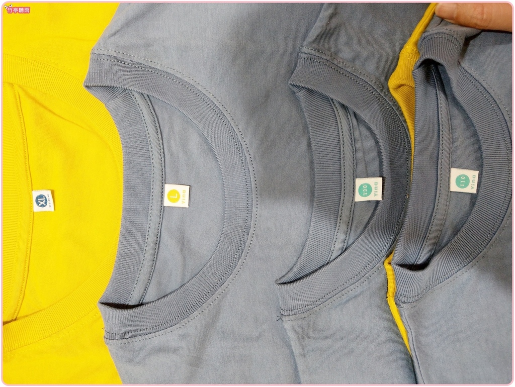 材質是100%純棉,雖然標示寫說不可烘乾,但用了烘衣機就回不去了,所以乾脆都買大一點的衣服讓它縮XD