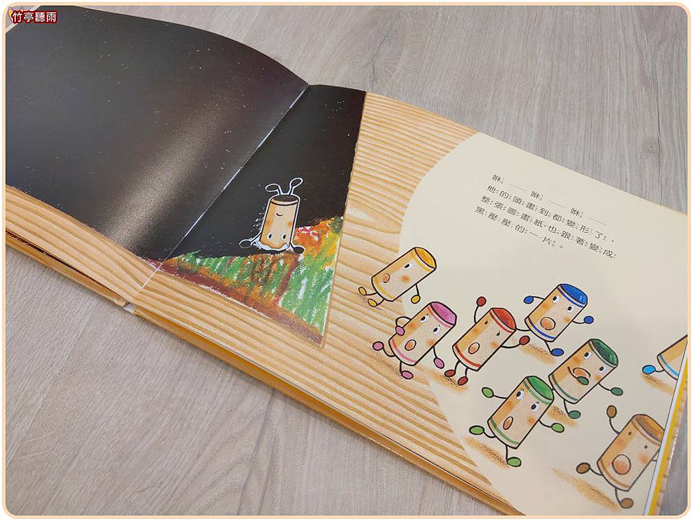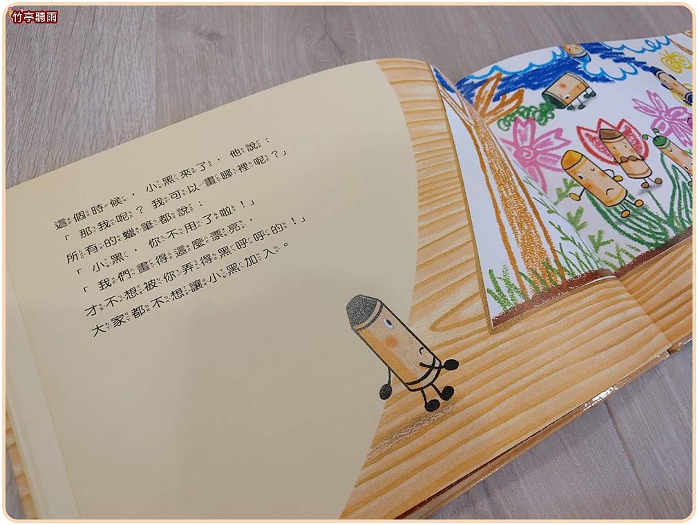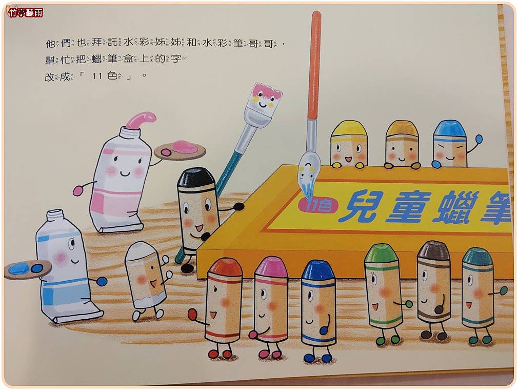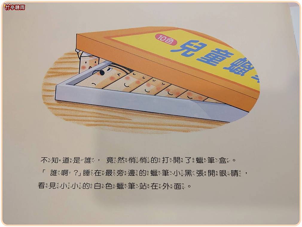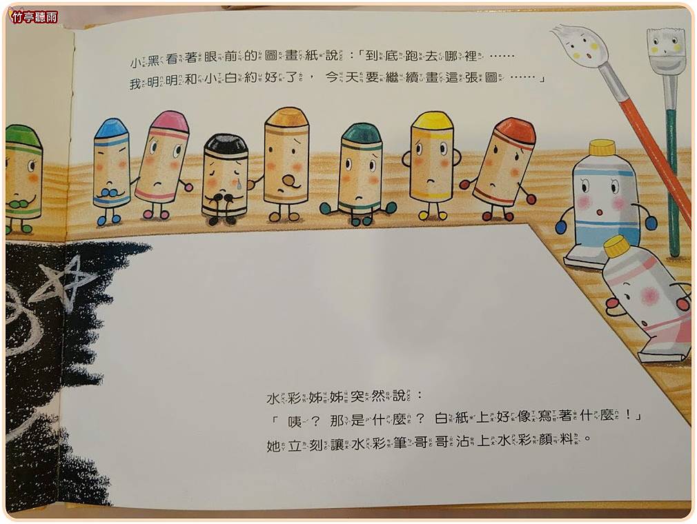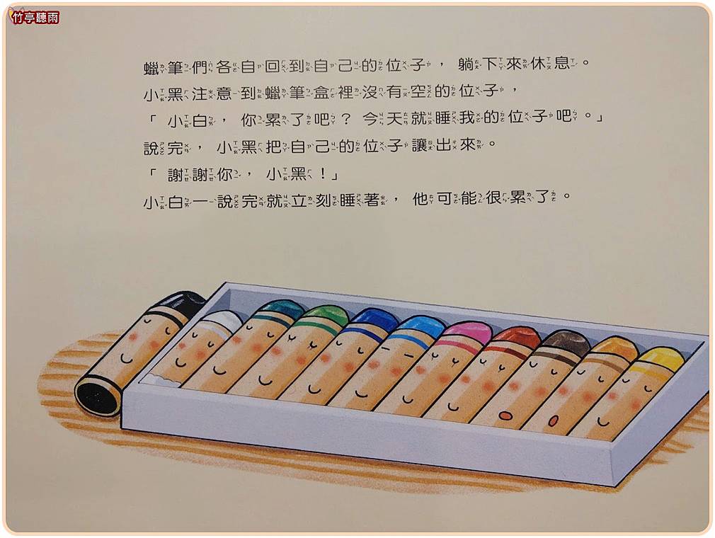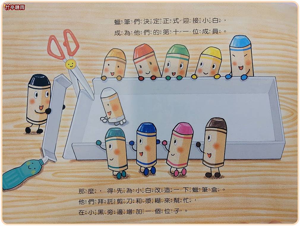 這本我們看到蠟筆們接納新朋友的雅量,小黑不但主動出借位子給陌生的小白睡,後來他們還願意改造蠟筆盒來接納新夥伴。