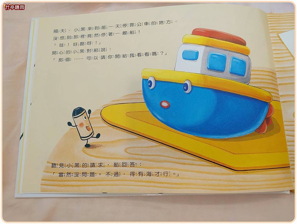 隔天小黑去停靠公車的地方,意外的發現今天停了一艘船,於是小黑也很開心地請他開船,但船說得先有海才行。