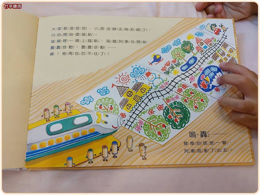彩色蠟筆拜託小黑畫軌道,小黑本來很不願意,但禁不起大家的遊說,終於還是在留白的地方畫起了軌道。