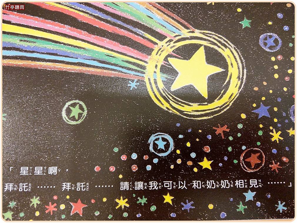 老鼠爺爺看到流星就許下了一個願望: 「星星啊...拜託...請讓我可以和奶奶相見...」(這裡的奶奶應該是指他老婆,日本人也習慣用小孩的角度來稱呼大人)