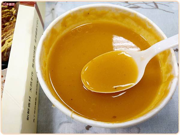 方形餐盒附的紅蘿蔔濃湯也很健康,清香好喝。