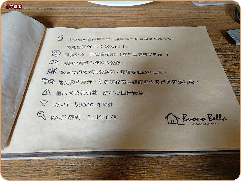 這次我們就來到了這間波諾義大利餐廳,預先上網看過食記,對此間最大的印象就是不提供水也不能自己帶水,只能購買店內的氣泡水或礦泉水90元一瓶。