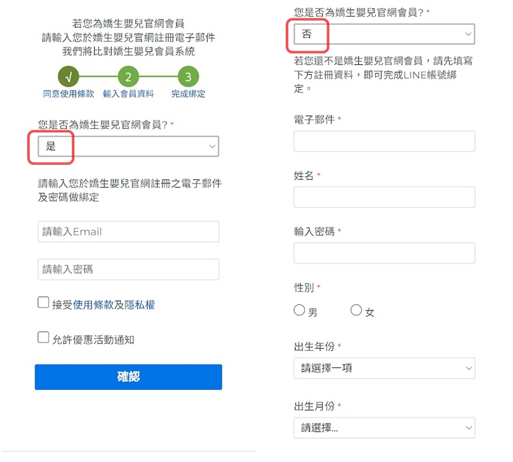 按下許可後,會問你有沒有會員,有的話輸入帳密登入即可,如果沒有會員可以直接在此畫面輸入資料進行註冊,即可完成LINE帳號綁定,獲得不定期好康。