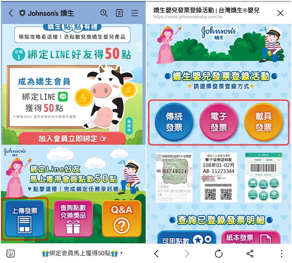 雖然我家是嬌生的愛用戶,但最近聽媽媽朋友分享才知道嬌生有嬌生嬰兒會員簡單集點換正貨的活動,之前都不曉得,發票都不曉得丟哪去了實在太可惜了!! 好康快來報給大家知道,簡單來說就是 綁定LINE好友(加入嬌生嬰兒會員) -> 上傳嬌生發票 ->積點兌換嬌生商品! 按照以下步驟即可輕鬆完成唷: