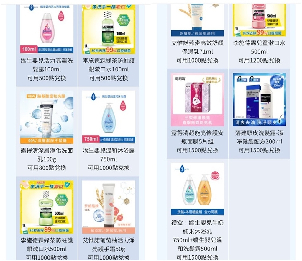 下圖是目前可以兌換的禮品,除了嬰兒洗髮露、沐浴露、純米沐浴乳與溫和洗髮露外,也有李施德霖漱口水、露得清洗面乳、艾惟諾保濕乳與護手霜、露得清面膜等商品,大人小孩的都有!