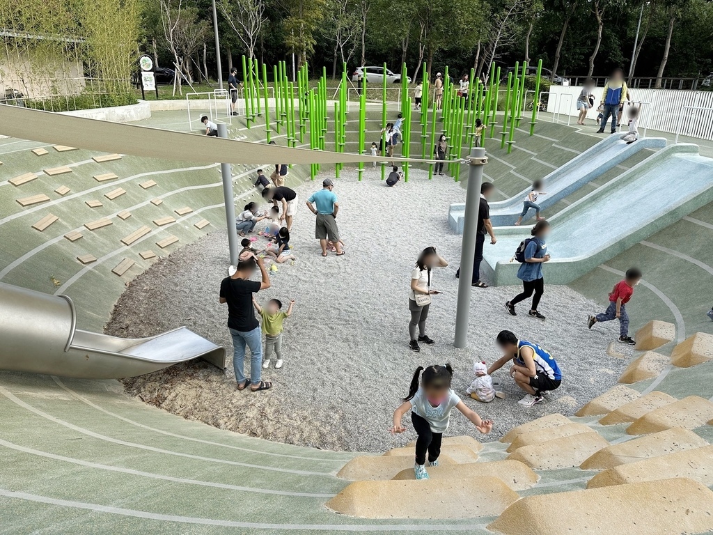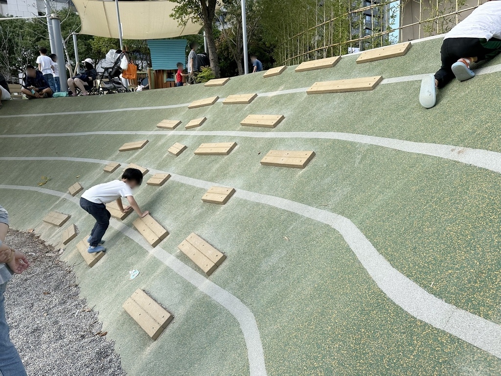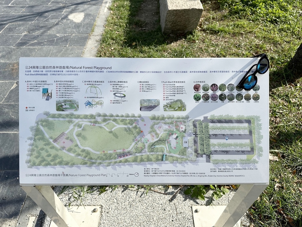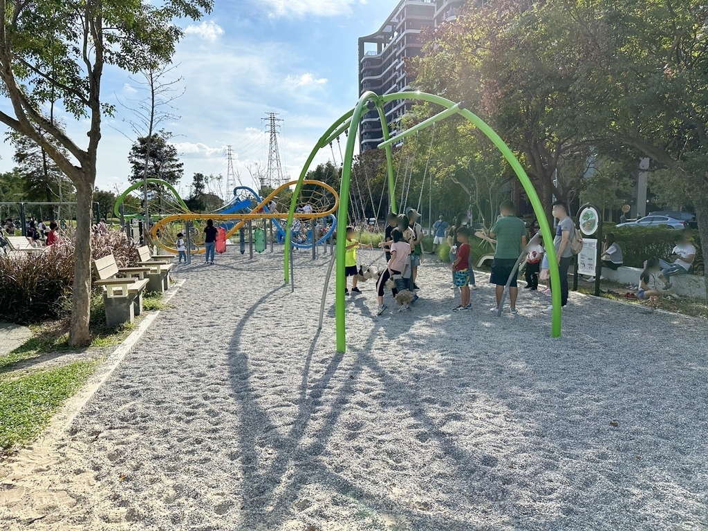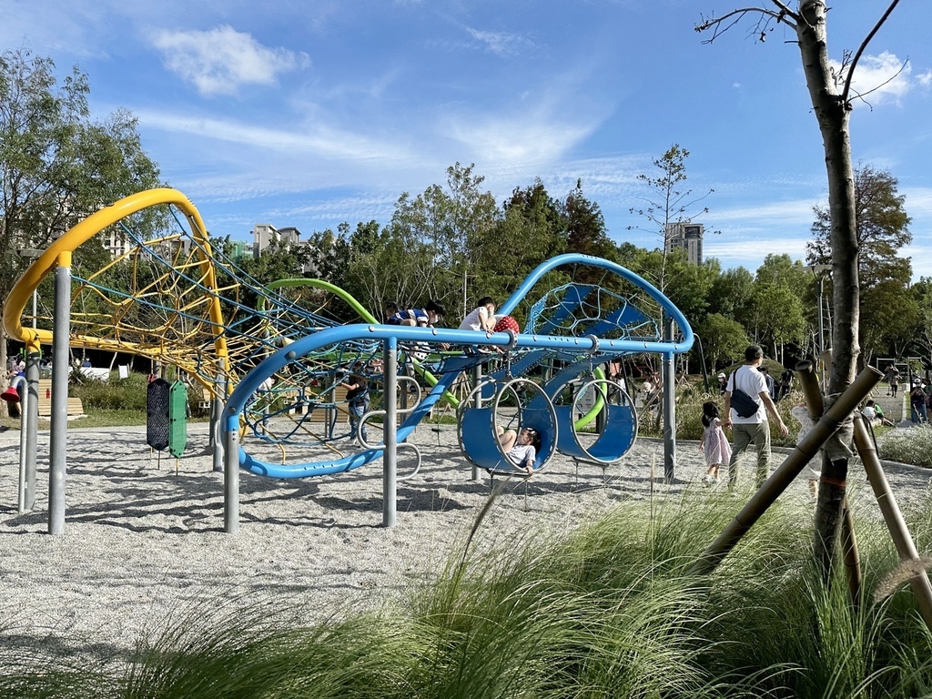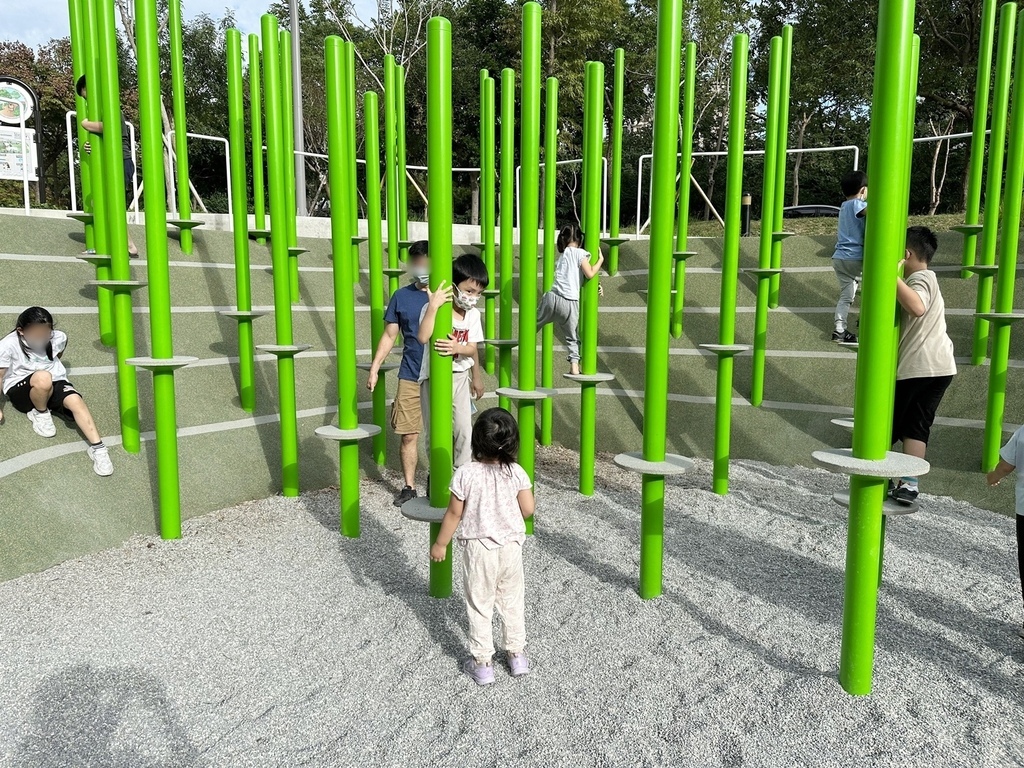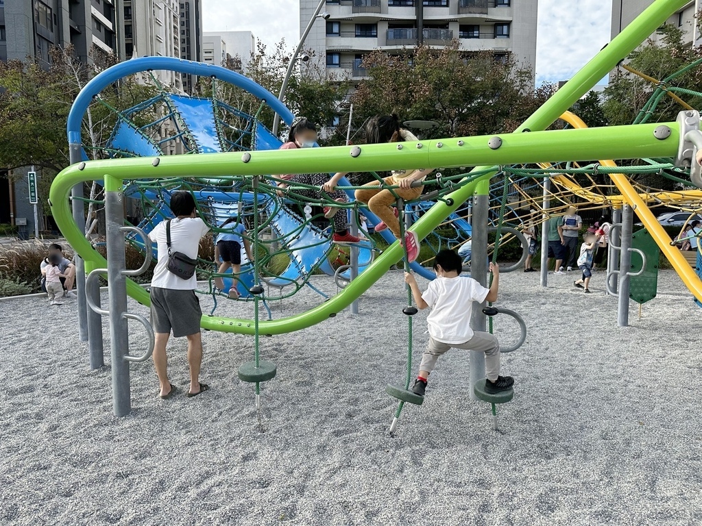 (有傾斜與上下起伏較陡,難度較高) 竹北AI智慧園區公園,超多元遊具: 起伏滑步車跑道、溜索、全罩和石頭溜滑梯、攀岩、繩索通道、沙坑、各種盪鞦韆