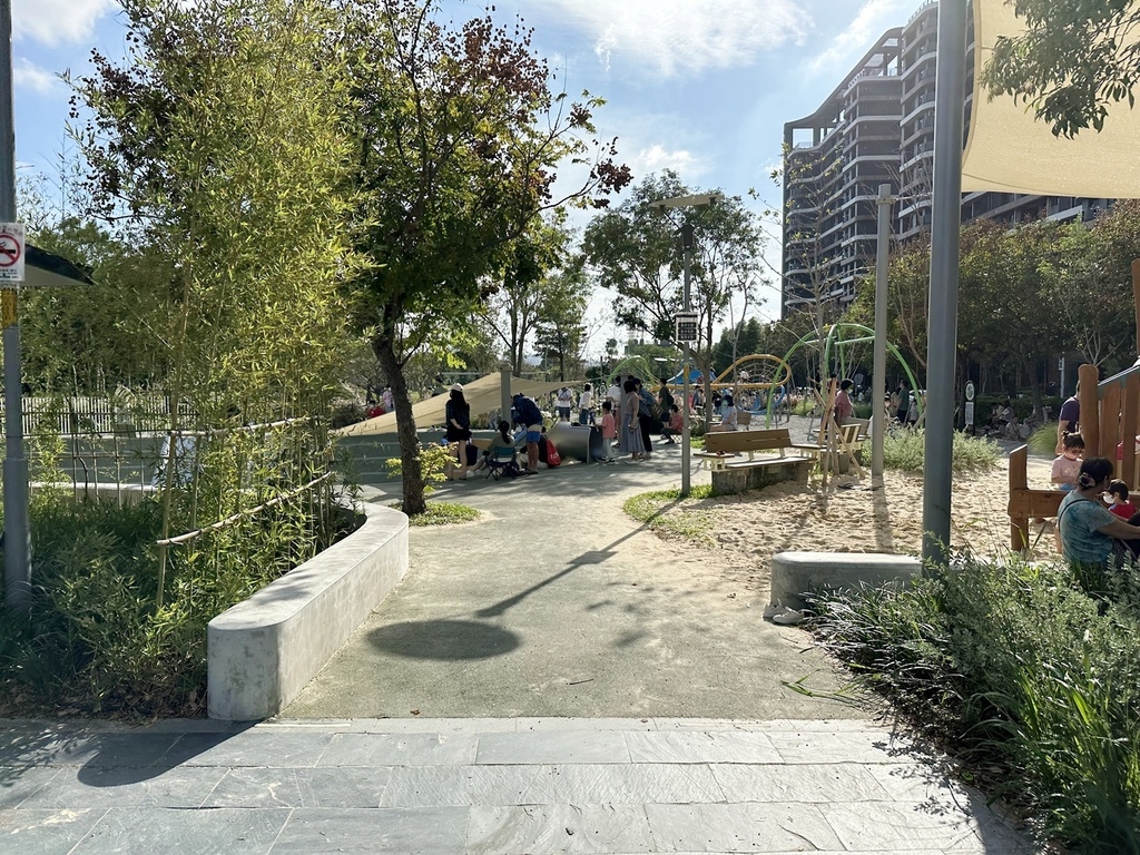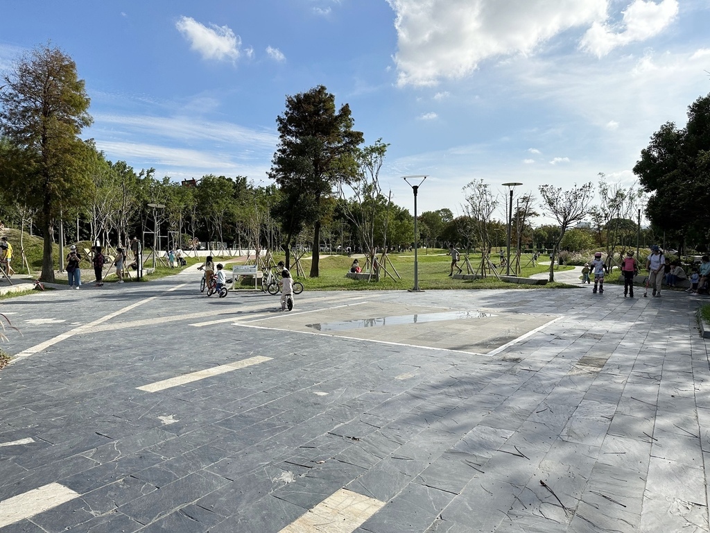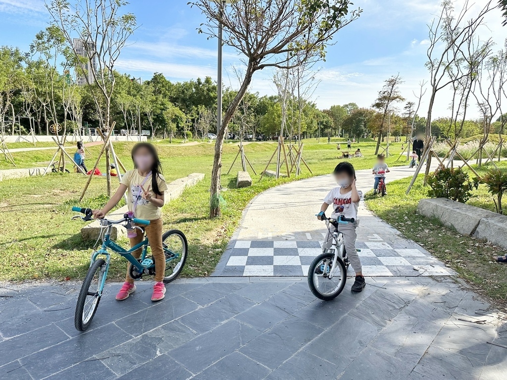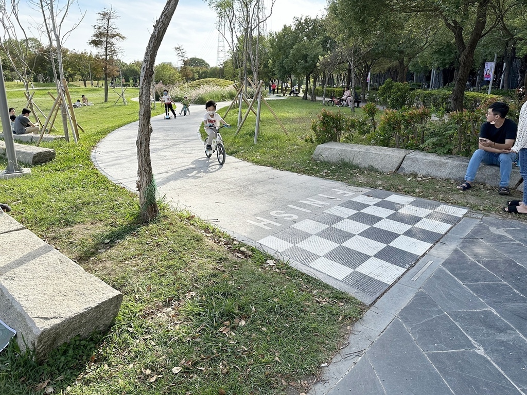 繞一圈蠻大的,影片在文章開頭處,高低起伏程度比起頭前溪滑步車道來的小一點,但全圈長度較長,中間草地地勢較低,家長比較難隨時看到小孩位置,比較適合較大一點的孩童,建議先約定好集合地點以點找不到人。