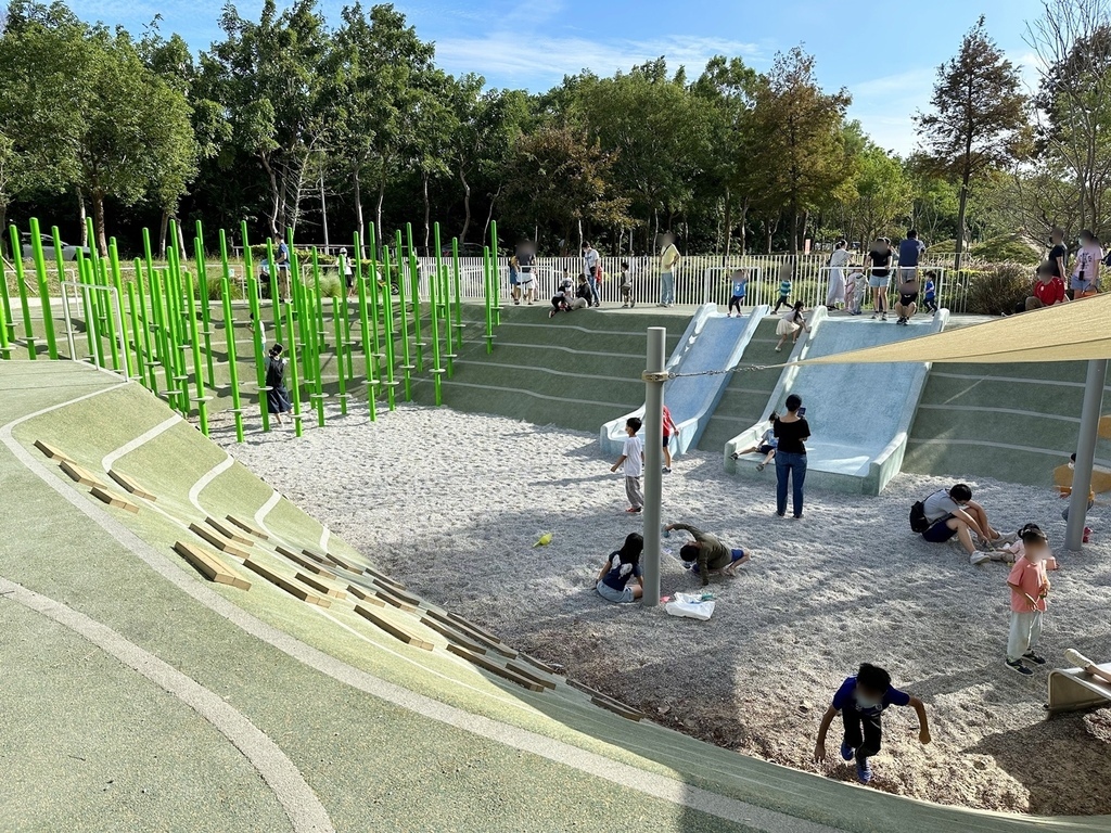另一面有兩道小溜滑梯呢! 還有挖土機遊具。越到傍晚人越多。