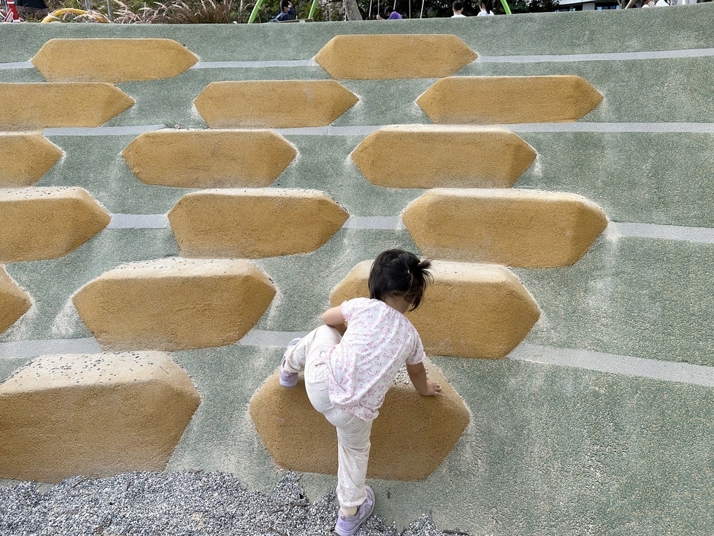 1. 最簡單的方式是從這個類似樓梯的大塊黃色階梯爬上去。但沒扶手,幼兒的話還是得家長扶著比較安全。