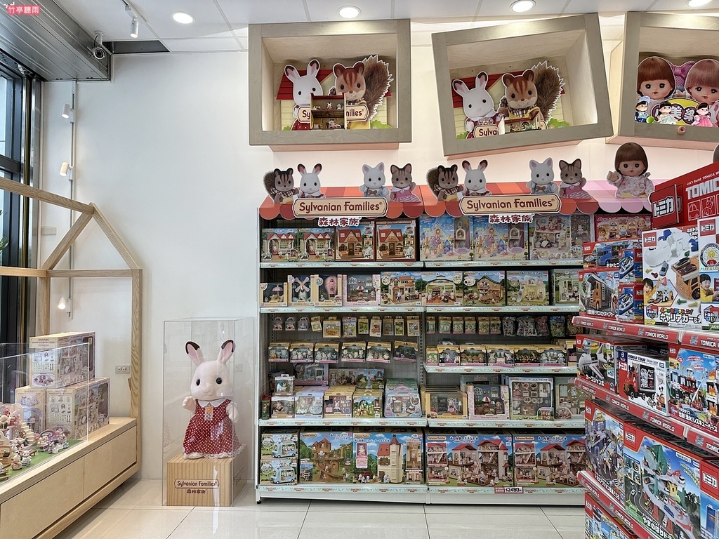 一樓一踏進去就看到天花板都是彩色的英文字母,充滿了童趣感。看到整面的TOMICA軌道玩具、左邊是森林家族、小美樂娃娃系列,都是超吸引小朋友的知名品牌!