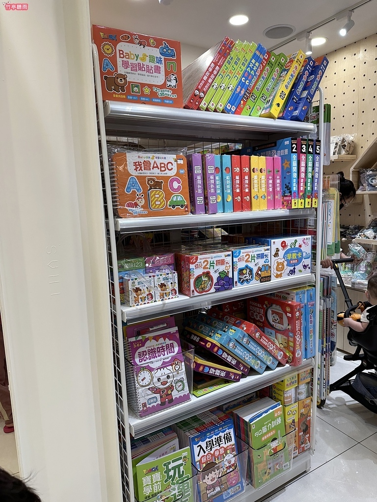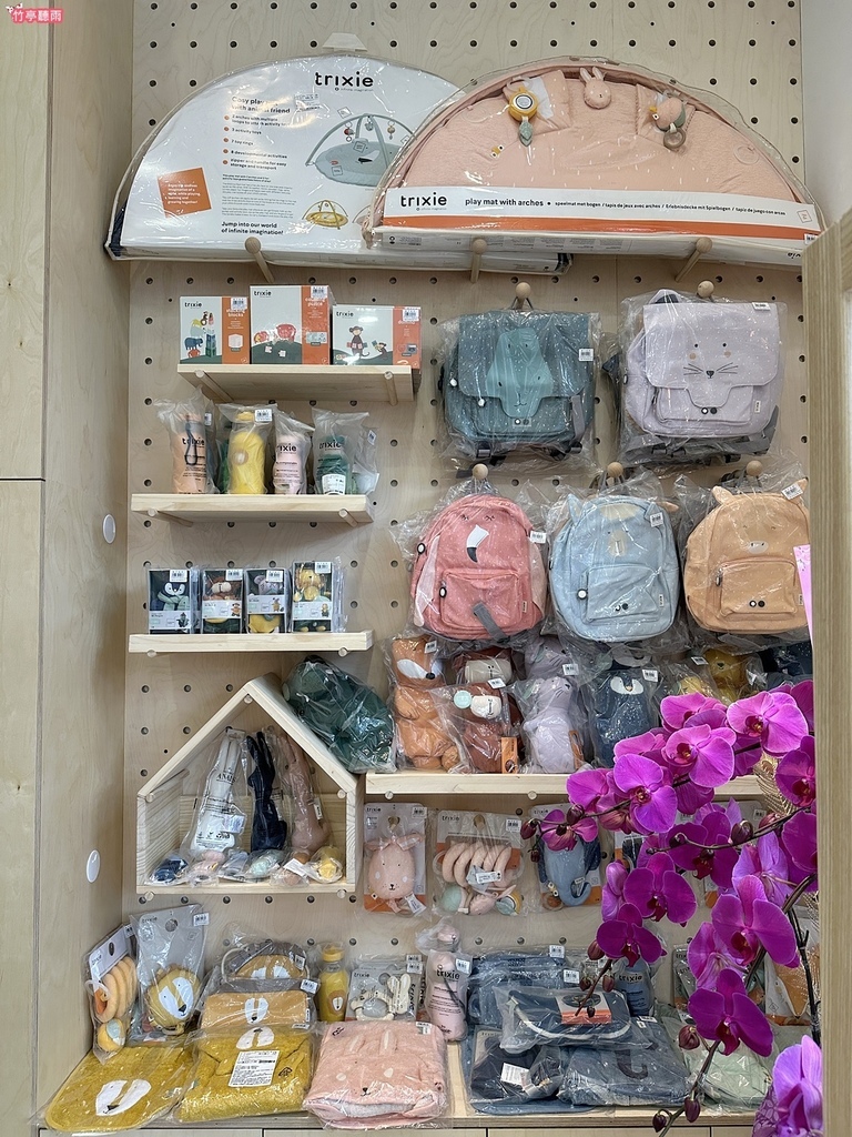 牆壁另一邊也是這種看起來可以自由調整的活動架設計,嬰兒商品擺放的很美。