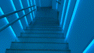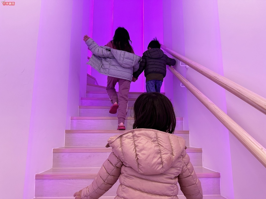 接著我們來到孩子玩伴的樓梯,這裡的樓梯超特別,牆壁的光線會變換色彩,就像在走什麼神秘的異次元隧道~~