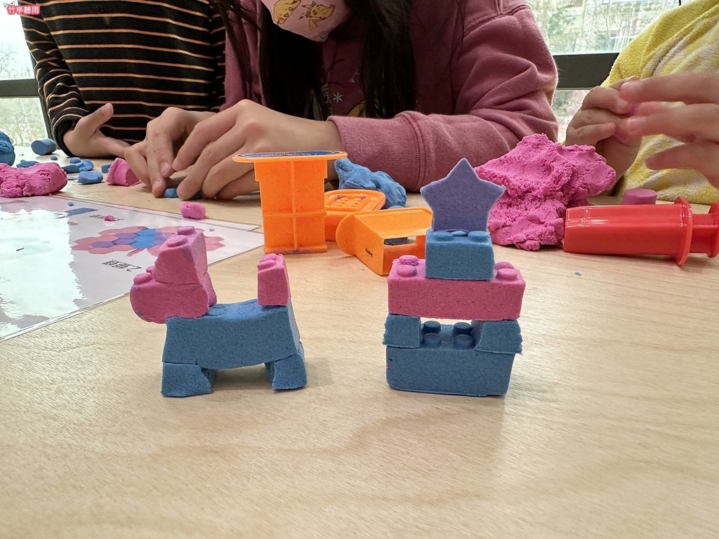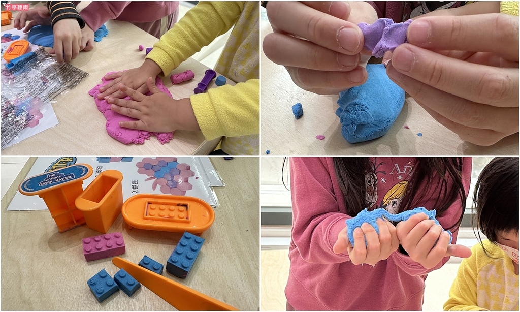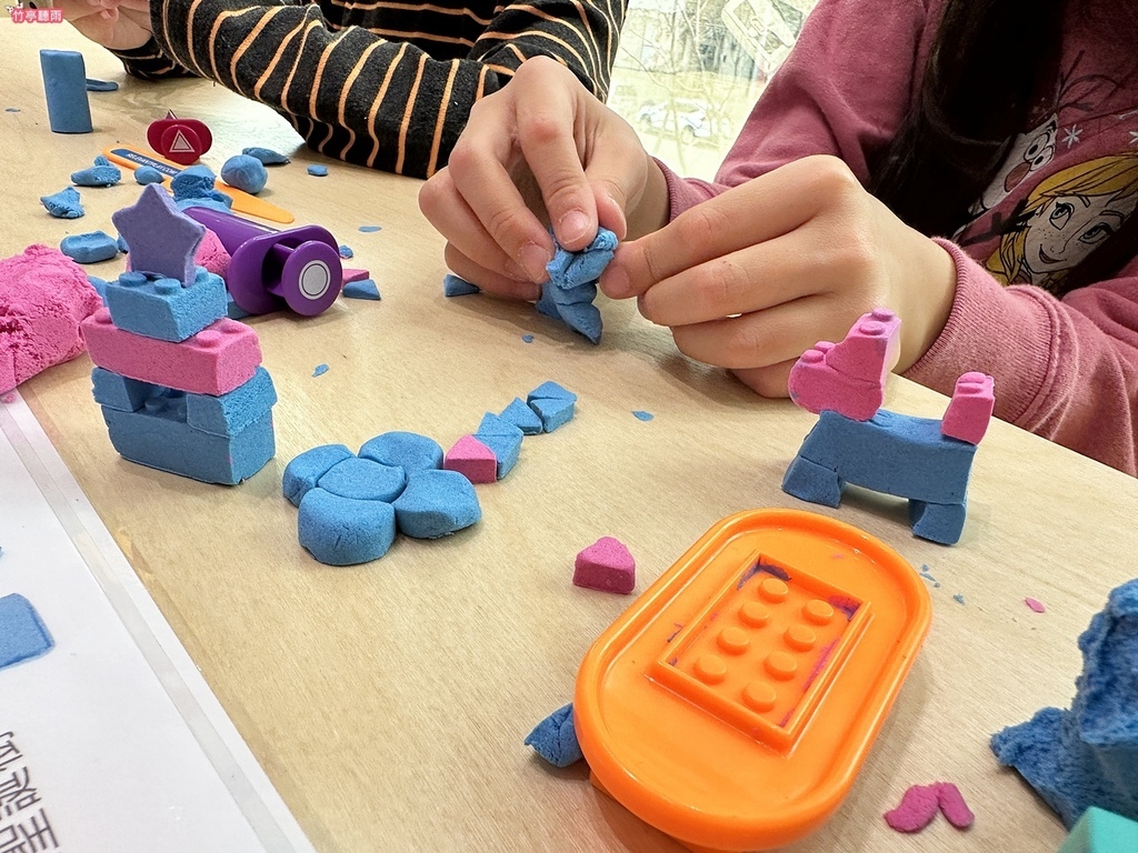 這種沙子捏起來有點像黏土,不太會散落滿地,而且據老師說也不像黏土會乾掉,真的好神奇!
