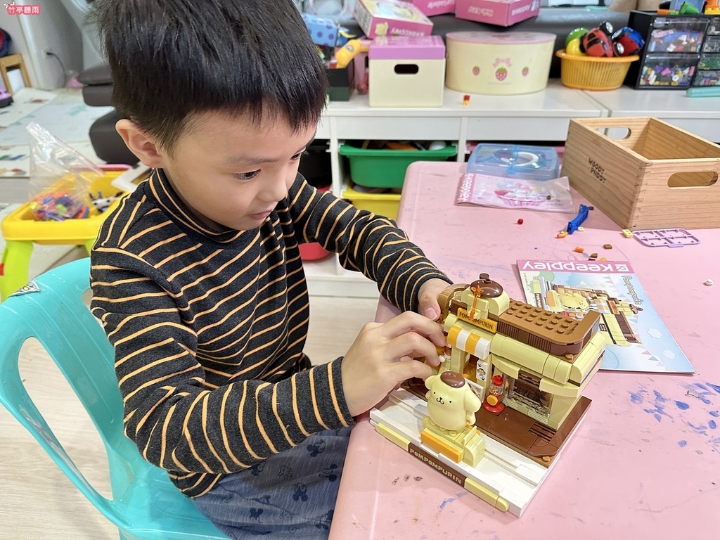 Keeppley是我們家最近的新寵,有許多可愛的街景積木,小小咪跟球寶都各挑了一盒回家做,還希望下次再來買同系列別款的。