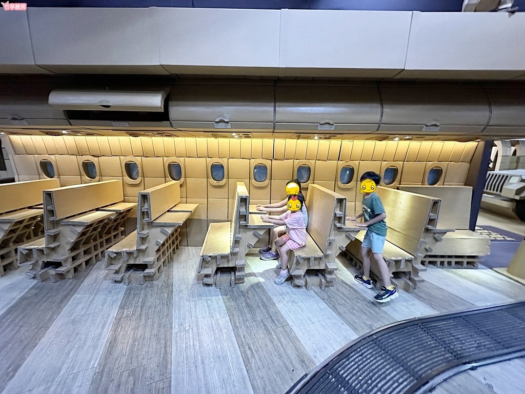 座位區有一面很特別的機艙座椅,模仿飛機的窗戶與座位,剛好小孩們暑假有搭飛機,覺得很有FU~