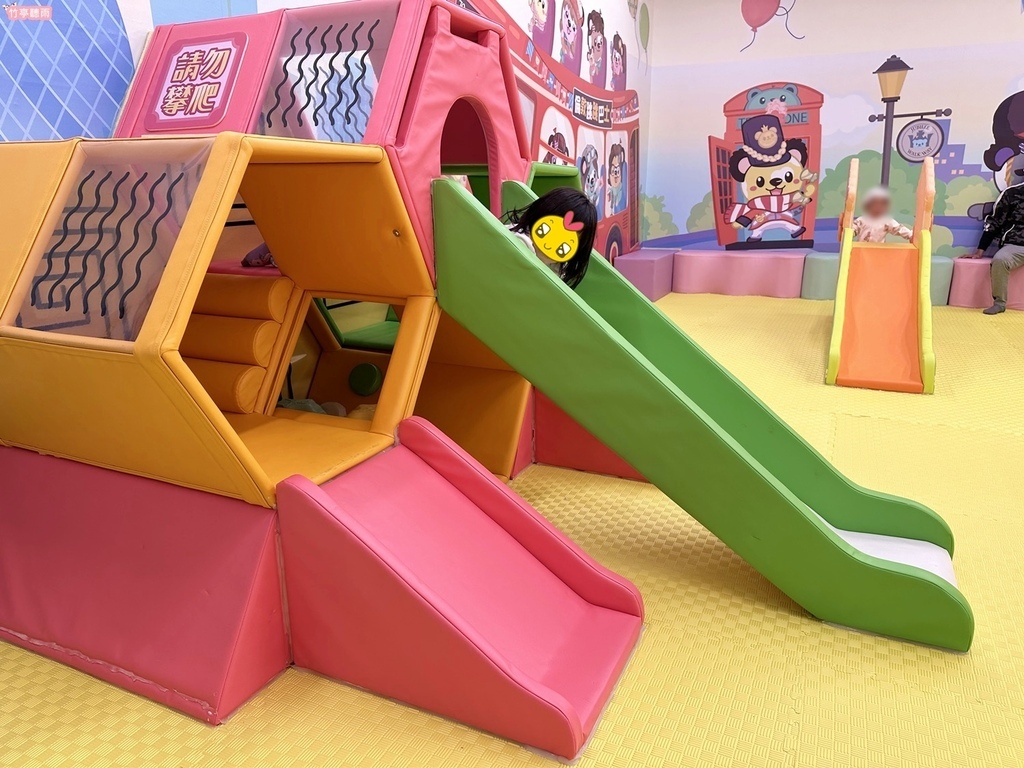 這塊黃色巧拼區域是最近翻新的區塊,增添了適合嬰幼兒運動跑跳的六角形蜂巢攀爬溜滑梯、各種小型溜滑梯跟小山洞,這裡視野開闊,家長可以很容易照顧小小孩~