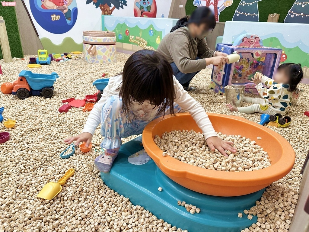 這裡有很多像小骰子的木粒沙,不會沾黏不怕弄髒衣服,還有各種玩沙工具,以及一個小型的全罩式溜滑梯。