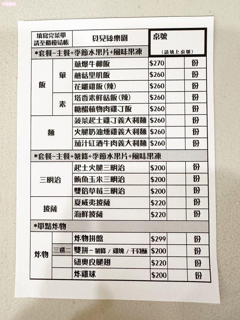 菜單如下,有飯或義大利麵套餐,或三明治、披薩、炸物等。