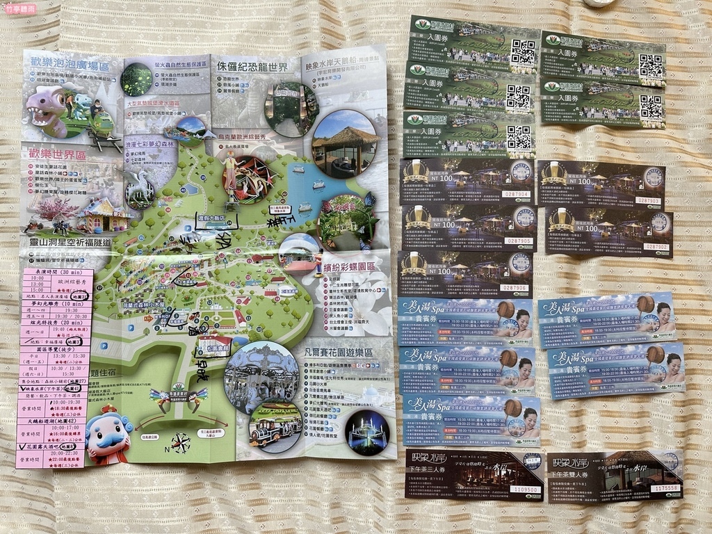 我們買的專案包含了一泊三食,早晚餐都報房號即可,另外有入園券(兩天都使用同張券入場,退房後可以繼續玩園區到關門)、美人湯SPA泡湯券(使用會收回)、映象水岸下午茶券、花園露天酒吧百元折價券。