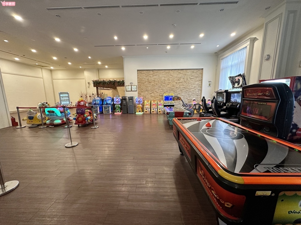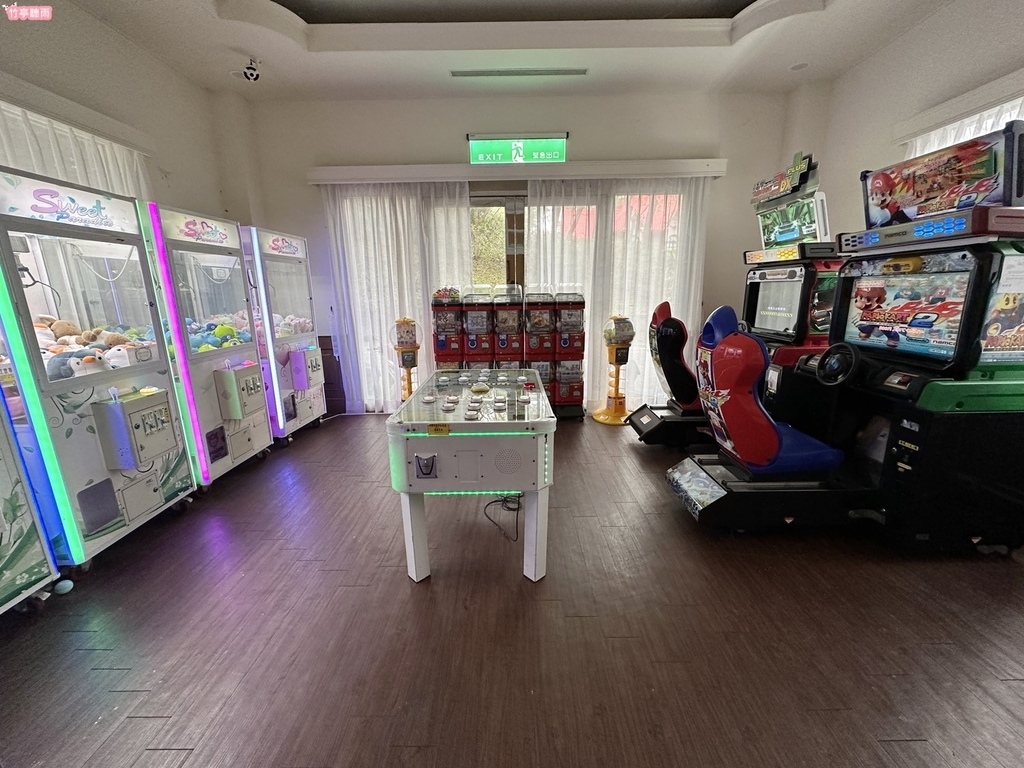 大廳有電玩遊戲室,需要投幣,種類還蠻多元的! 有懸浮桌上冰球、賽車、搖搖車、電動車、夾娃娃機、扭蛋機等等。
