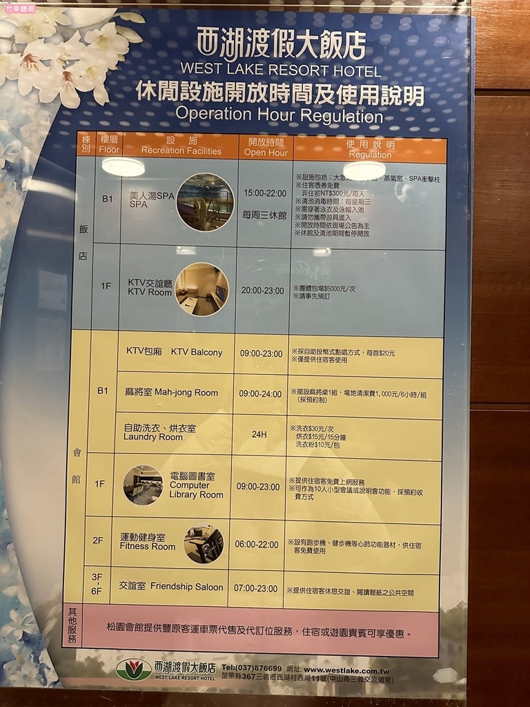 西湖渡假飯店有SPA、KTV、麻將室、自助洗衣烘衣、電腦圖書室、運動健身室、交誼室,有些在飯店、有些在松園會館,我們住的飯店有SPA泡湯從房間走過去很方便。