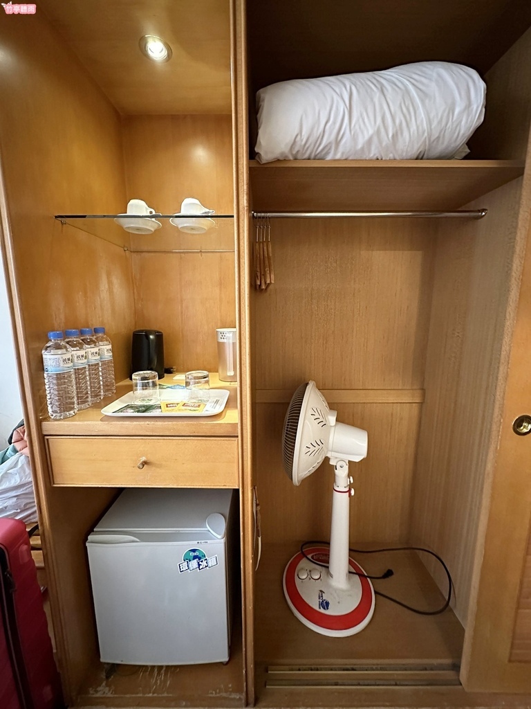 衣櫃上面有可以加的棉被,加右邊的另一櫃共有兩件,這邊晚上真的有點冷,所以還附了立式的電暖器。(空調只有冷氣功能)