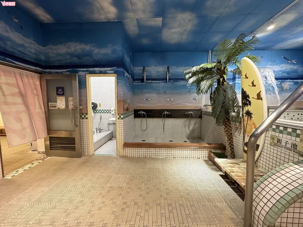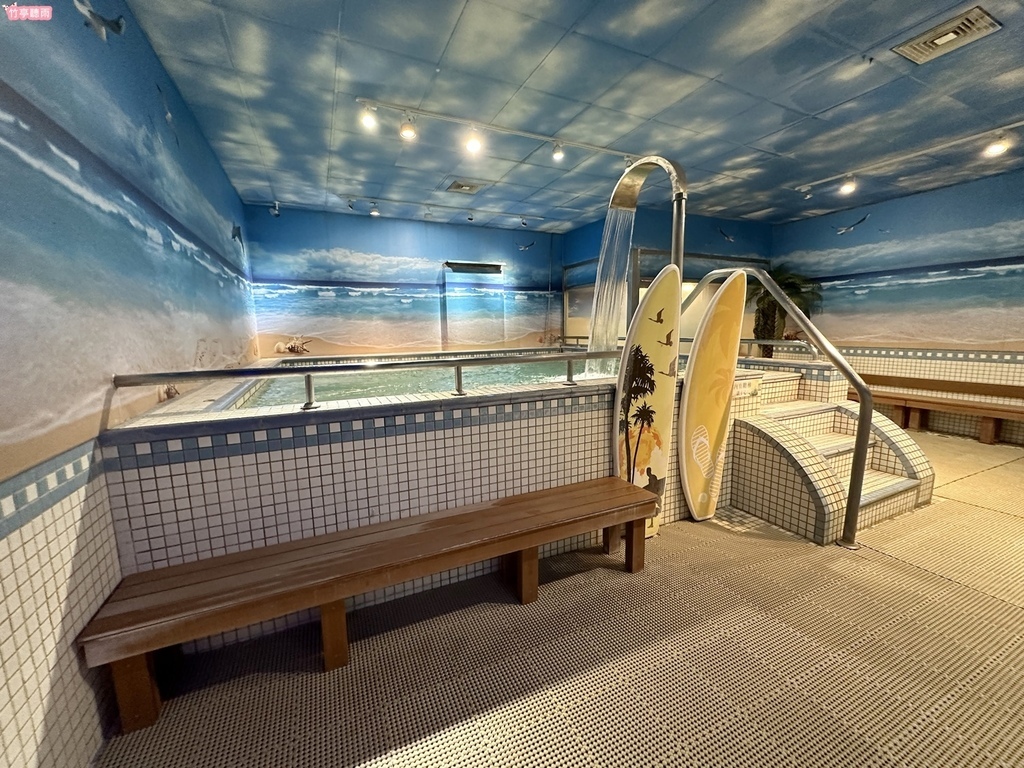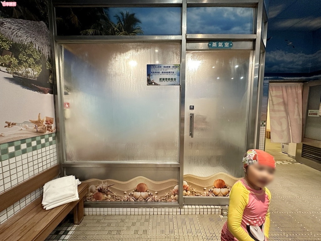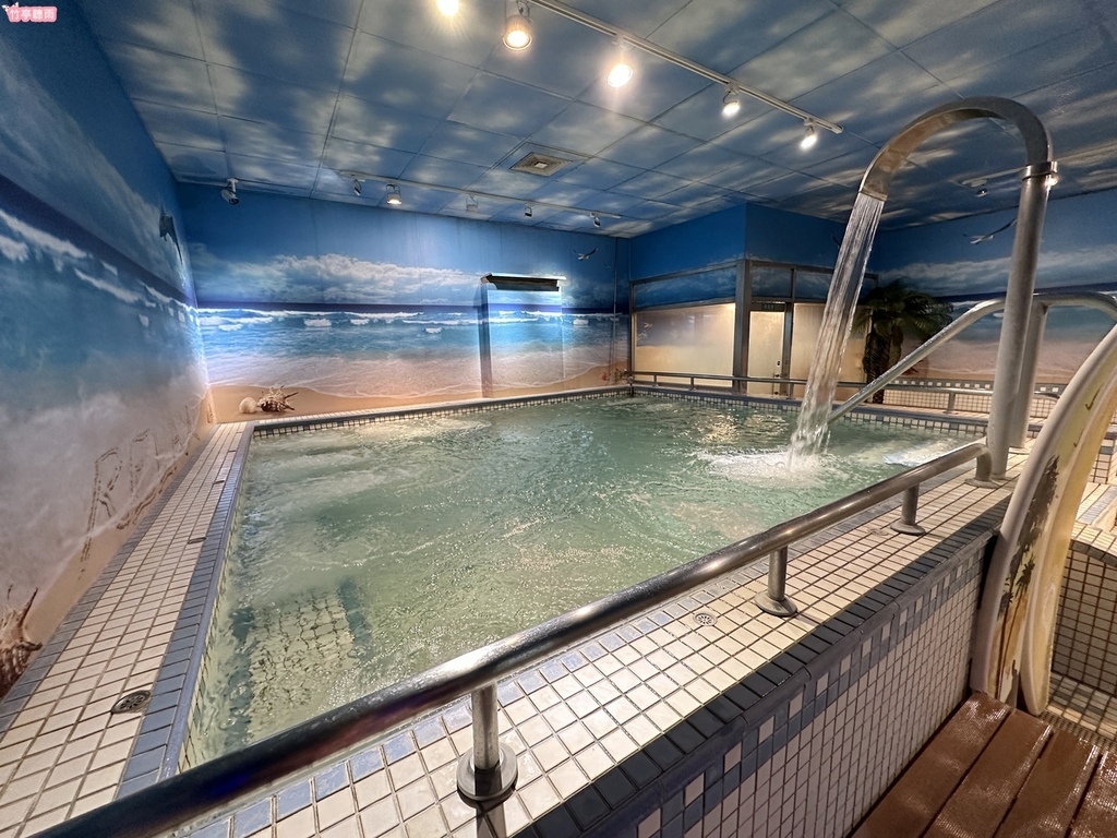 回來後趁著還沒到晚餐時間,就去泡來自地心2000公尺的碳酸氫鈉泉美人湯。開放時間為15:00~18:00、19:00~22:00。記得要穿泳衣褲及泳帽。拿券給櫃檯會發放浴巾,他們說直接把浴巾穿回房間也可以。女生跟男生更衣室分開,女生更衣室會通往比較淺的親子池,男生更衣室會通往比較深的大眾池,兩池之間有走廊可互通。