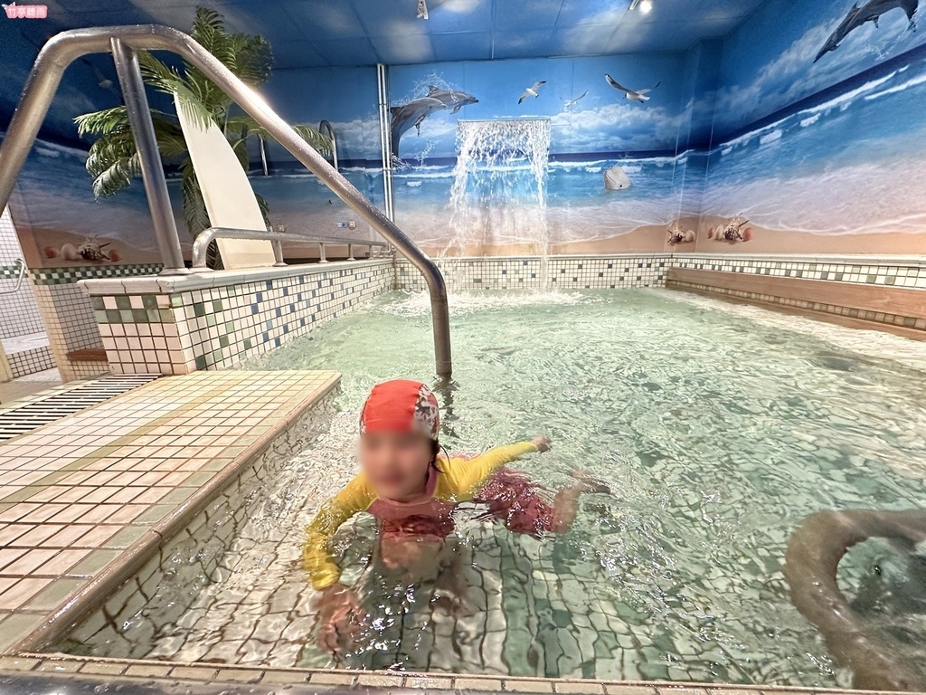 這是大眾池,池子稍大一點、水溫感覺也稍微熱一點,裡面也有比較多SPA可以沖,110cm的團團來這池其實也踩的到地,不過大人還是要顧著。