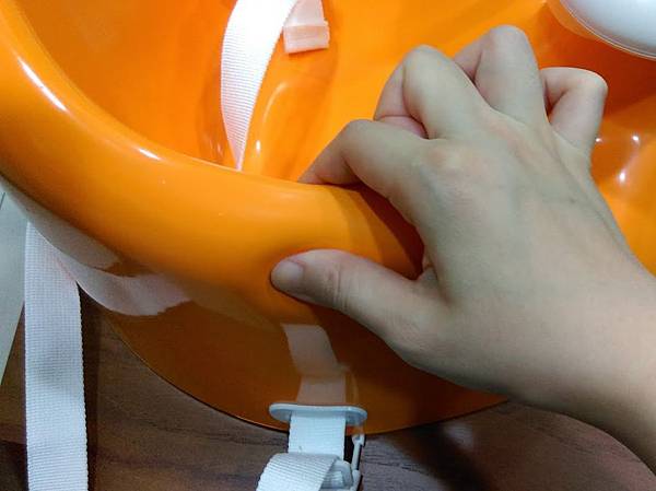 來試試看把他固定在大人的餐椅上: 很好,不能動了,用力扯也不會傾倒。