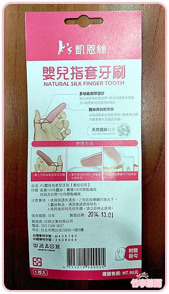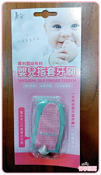 正傷腦筋的時候發現有一種指套型的嬰兒牙刷,號稱是用專利蠶絲布料製成的: